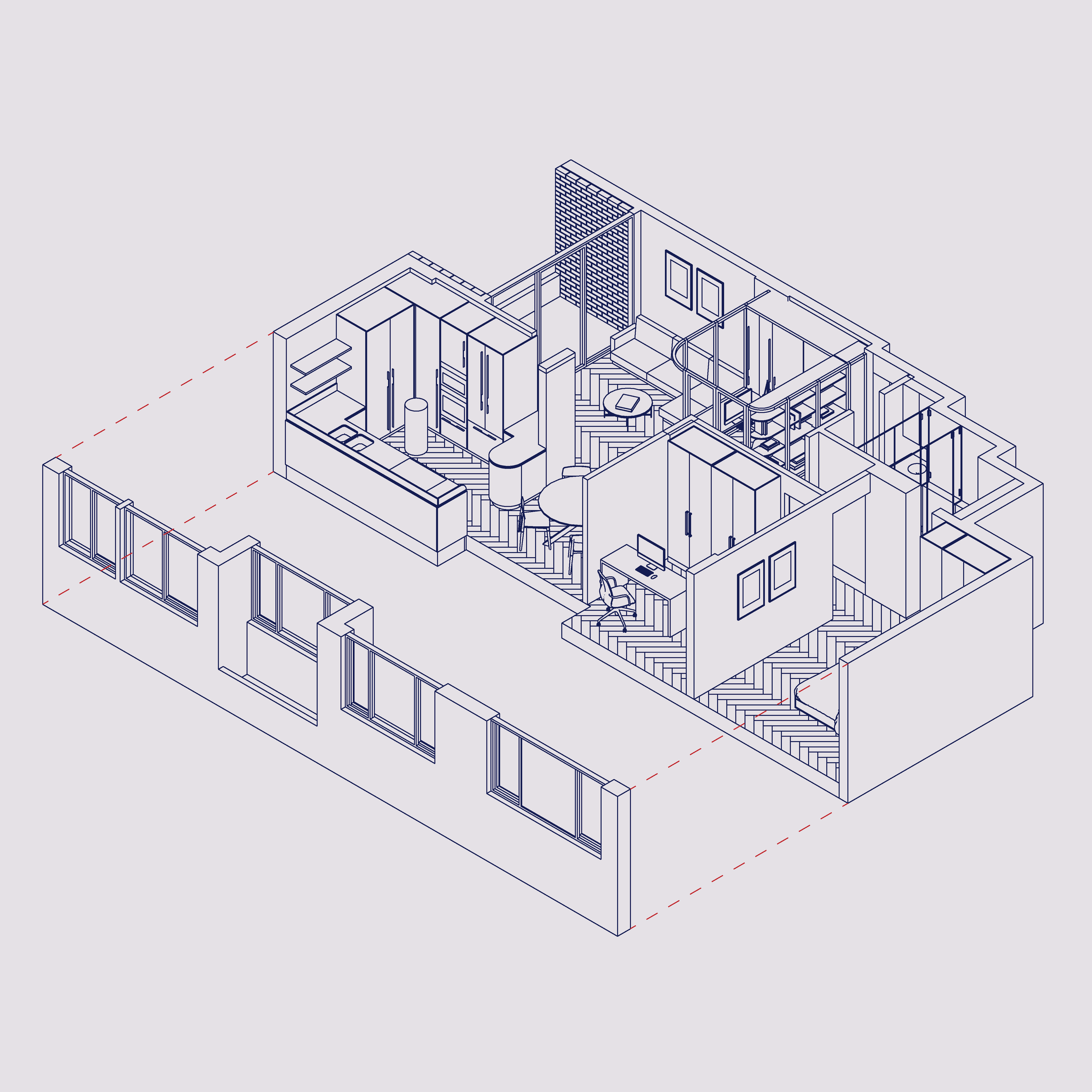 Responding to the clients’ desire for simplicity, the material palette is elemental, yet tactile - brushed black metalwork adds definition to the cool grey tones of the kitchen joinery, floating lightly above a natural washed oak parquetry floor. A frameless curved glass enclosure frames the study without interrupting the open plan connections between working, dining, cooking, and living.